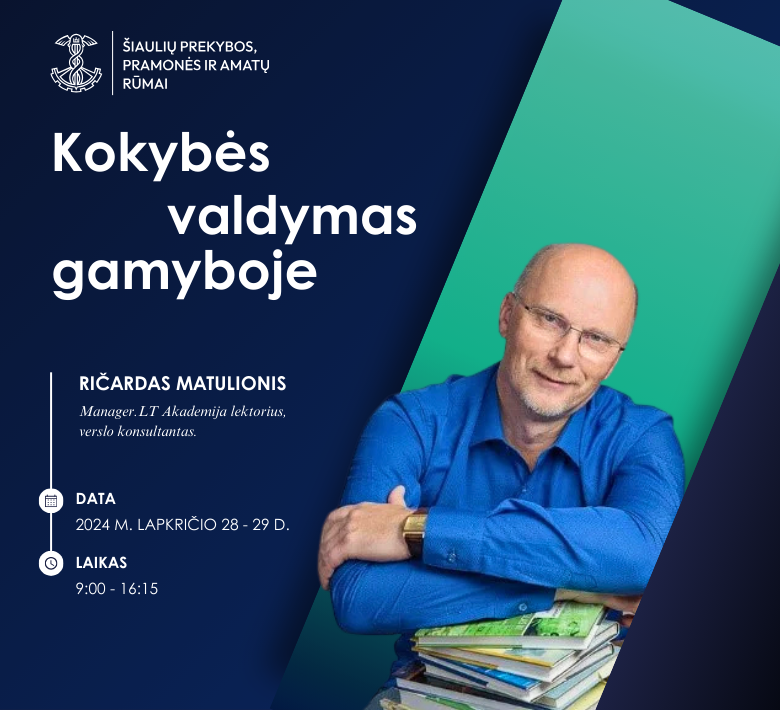 Mokymų kaina dalyviui – 380 Eur. Šiaulių prekybos, pramonės ir amatų rūmų nariams kaina – 300 Eur