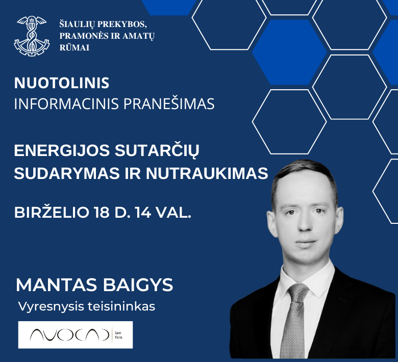 Jau š. m. birželio 18 d. 14 val. kviečiame į susitikimą su advokatų profesinės bendrijos AVOCAD teisininku Mantu Baigiu, kuris apžvelgs tai, ką būtina žinoti verslui, perkant paslaugas iš energijos tiekėjų.