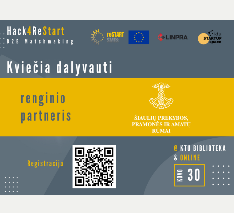 Kviečiame į Lietuvos inžinerijos ir technologijų pramonės asociacijos (LINPRA), Kauno technologijos universiteto (KTU) atstovų bei informacinių partnerių -Šiaulių ir kitų regioninių prekybos, pramonės ir amatų rūmų – organizuojamą „Hack4ReStart | B2B Matchmaking“ renginį, kurio tikslas – skatinti įvairių sričių gamybos įmonių ir technologinius sprendimus bei paslaugas teikiančių MVĮ bendradarbiavimą, inovacijų vystymą pramonėje ir konkrečių gamybos iššūkių sprendimą šiose srityse: