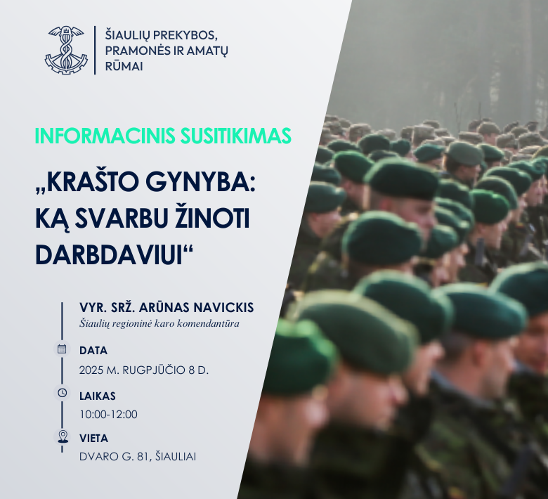 Rugpjūčio 8 d. 10 val. kviečiame narius į informacinį susitikimą Šiaulių regioniniame karo prievolės ir komplektavimo skyriuje (Dvaro g. 81, Šiauliai). Šiaulių regioninės karo komendantūros atstovas vyr. srž. Arūnas Navickis pristatys Lietuvos kariuomenės siūlomas galimybes verslui, apžvelgs praktines situacijas, su kuriomis susiduria darbdaviai (tarnybos atidėjimas, išvykimas į mokymus, šaukimo gavimas) bei galimas bendradarbiavimo formas.