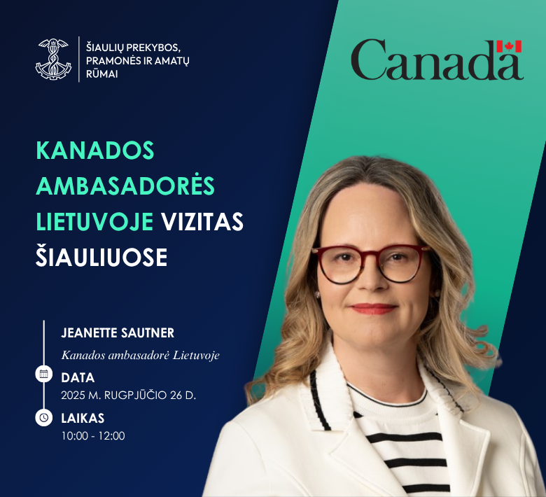 Rugpjūčio 26 d. (antradienį) Šiauliuose lankysis Kanados ambasadorė Lietuvoje Jeanette Sautner ir Kanados ambasados prekybos atstovė Eglė Jurkevičienė. Vizito metu planuojamas susitikimas su verslo bendruomene Šiaulių prekybos, pramonės ir amatų rūmuose.