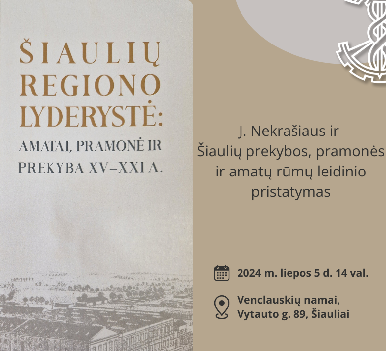 Liepos 5 dieną 14 val. kviečiame į J. Nekrašiaus ir Šiaulių prekybos, pramonės ir amatų rūmų knygos „Šiaulių regiono lyderystė: amatai, pramonė ir prekyba XV – XXI a.“ pristatymą.