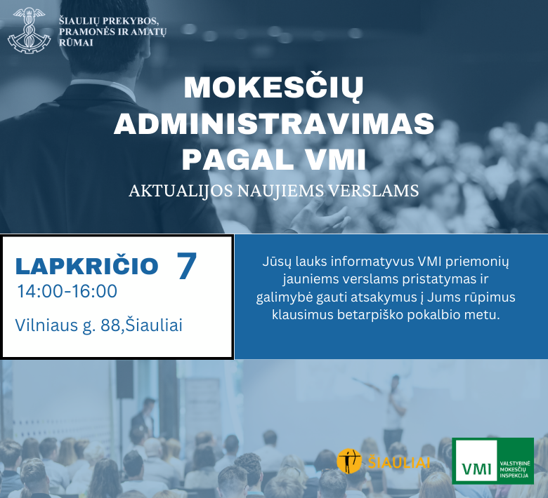 Jūsų lauks informatyvus VMI priemonių jauniems verslams pristatymas ir galimybė gauti atsakymus į Jums rūpimus klausimus betarpiško pokalbio metu.