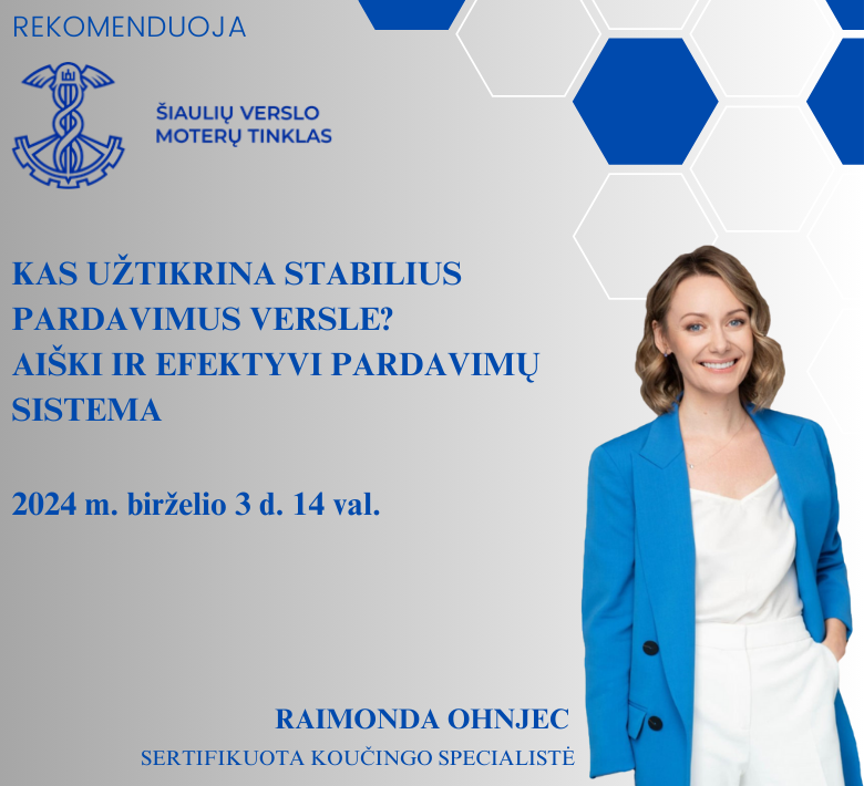 Šiaulių verslo moterų tinklas rekomenduoja ir kviečia į susitikimą tema: „Kas užtikrina stabilius pardavimus versle? Aiški ir efektyvi pardavimų sistema“.