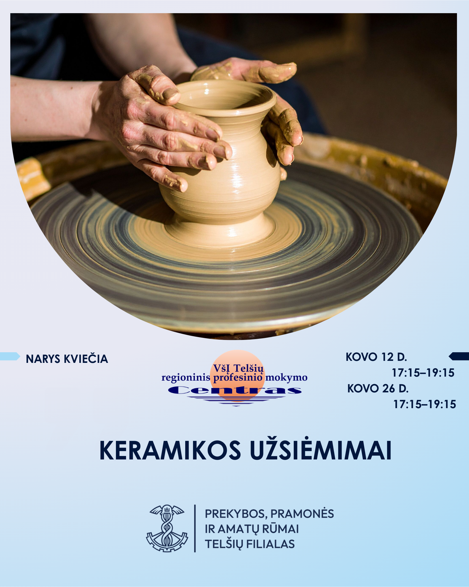 Kviečiame į jaukius ir kūrybiškus tęstinius keramikos užsiėmimus pas narį VšĮ Telšių regioninis profesinis mokymo centras, kuriuose laukia atsipalaidavimas, įkvėpimas ir galimybė savo rankomis sukurti unikalų darbą sau ar dovanai.