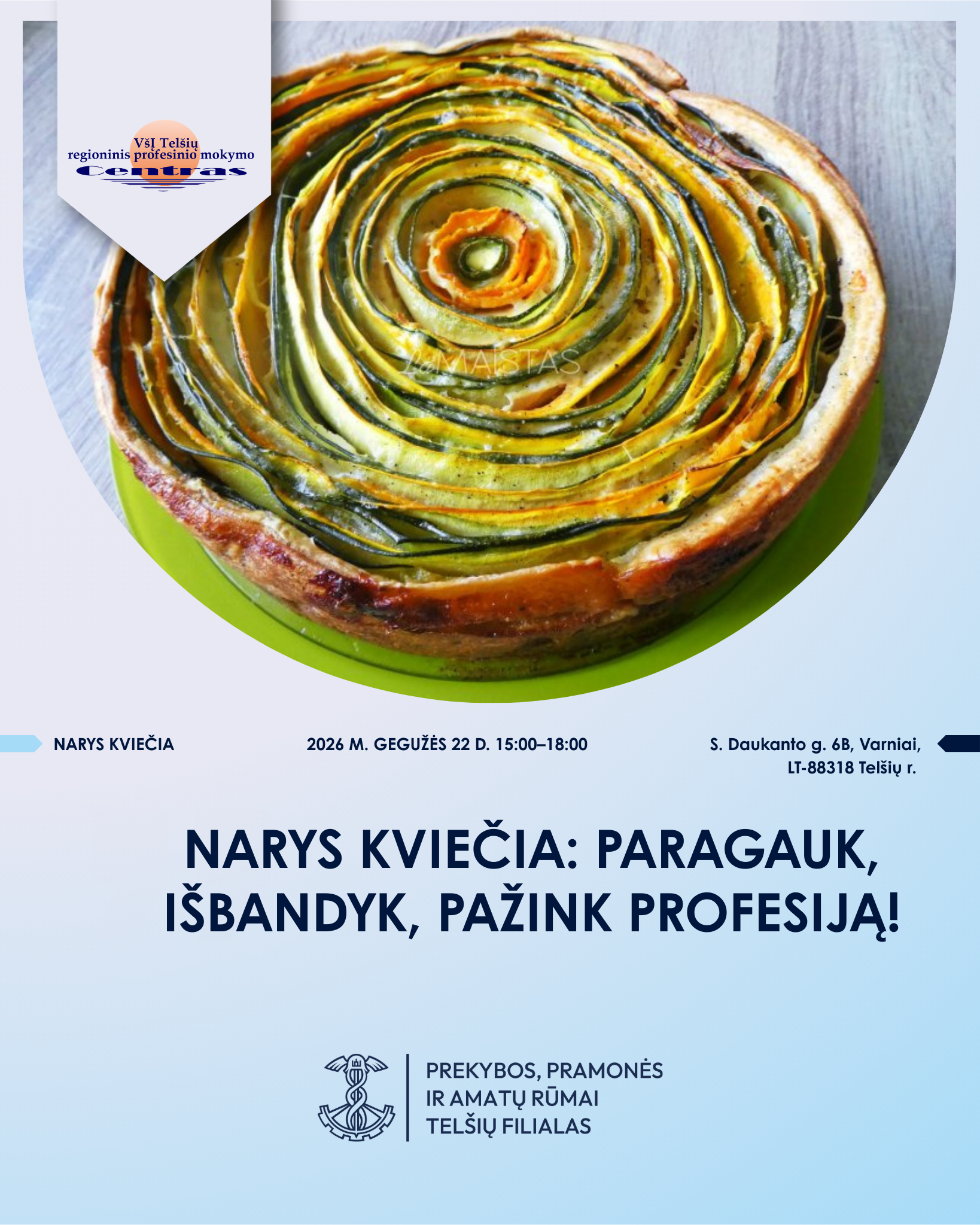 PPAR Telšių filialas kviečia į dar vieną jaukią, prasmingą ir skonių kupiną popietę, kurioje filialo narys – Telšių regioninis profesinio mokymo centras (RPMC) Varniuose – atveria savo erdves kitiems nariams ir kviečia ne tik smagiai praleisti laiką, bet ir iš arčiau pažinti profesinį rengimą, išbandyti savo jėgas bei atrasti naujus įgūdžius.