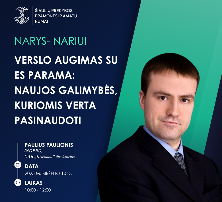 Pranešėjas: Paulius Paulionis – INOPRO, UAB „Kriedana“ direktorius, kurio vadovaujama ekspertų komanda turi ilgametę klientų konsultavimo, ES paramos projektų rengimo ir administravimo patirtį.