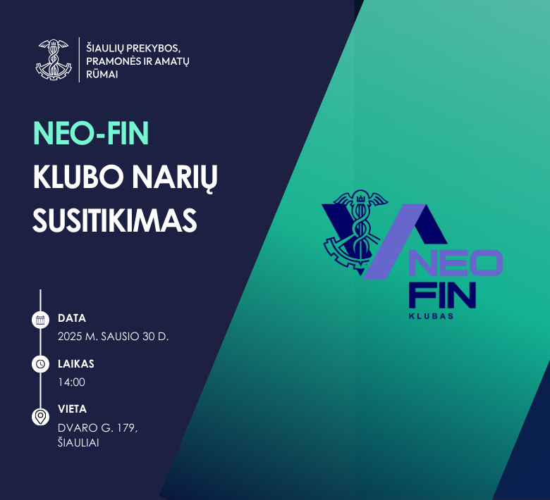 Pirmasis šių metų NEO-FIN klubo narių susitikimas vyks sausio 30 d., nuo 14 val., atnaujintame „Gubernija HUB“ lankytojų centre (Dvaro g. 179, Šiauliai).
