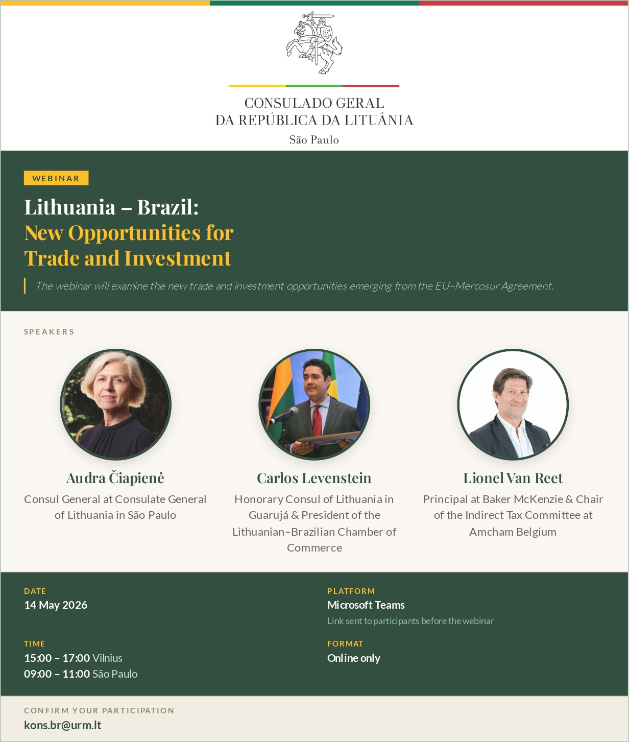 LR generalinis konsulatas San Paule kviečia dalyvauti š.m. gegužės 14 d. 15.00-17.00 val. Lietuvos laiku organizuojamame nuotoliniame seminare apie naujas prekybos ir investicijų galimybes Brazilijoje. Renginys vyks anglų kalba.