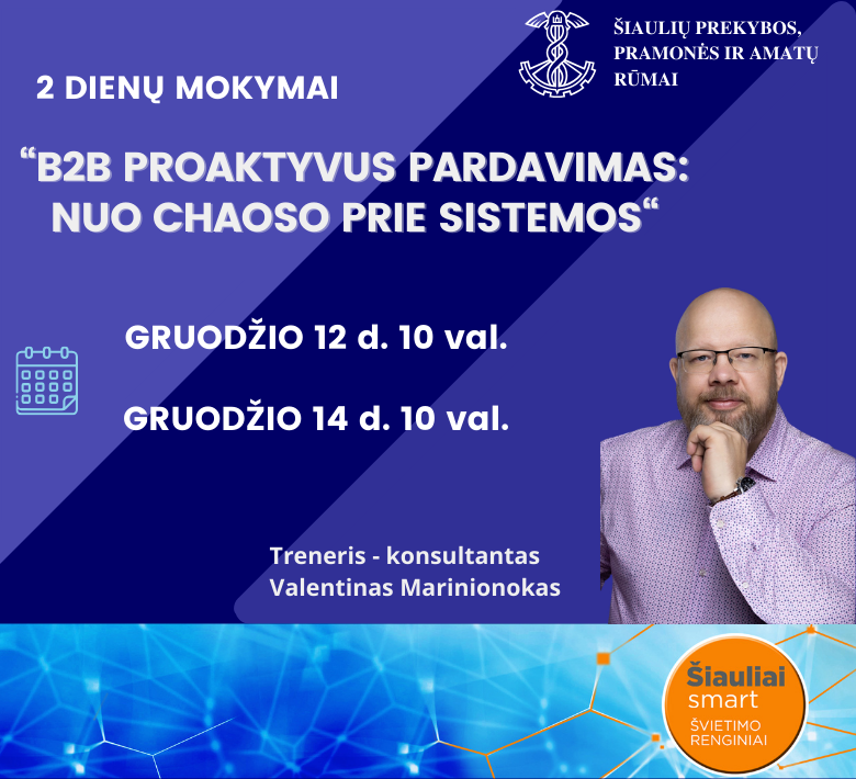 Dviejų dienų (gruodžio 12 ir gruodžio 14 d.) mokymai. „B2B proaktyvus pardavimas: nuo chaoso prie sistemos“