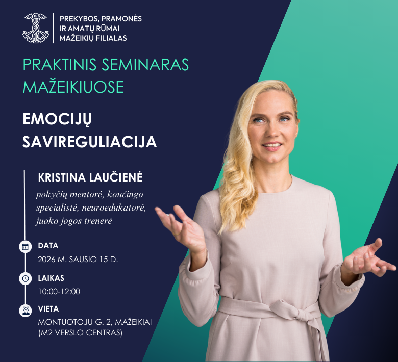 Sausio 15 d. kviečiame į praktinį seminarą tema „Emocijų savireguliacija“, kuris vyks Prekybos, pramonės ir amatų rūmų Mažeikių filiale (Montuotojų g. 2, M2 verslo centras).