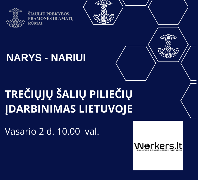 vasario 2 d. 10.00 val. Šiaulių PPAR nariai, profesionalias ir efektyvias darbuotojų atrankos paslaugas Lietuvoje ir užsienyje teikianti įmonė UAB ,,Laborina“ kviečia į pristatymą nariams „Trečiųjų šalių piliečių įdarbinimas Lietuvoje“.