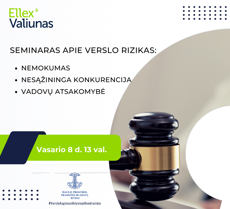 Vasario 8 d. 13 val. pas mus svečiuose trys teisininkai iš Ellex Valiunas teisinės kontoros, kurie pristatys kiekvienam įmonės vadovui aktualias temas ir, žinoma, atsakys į Jums rūpimus klausimus.