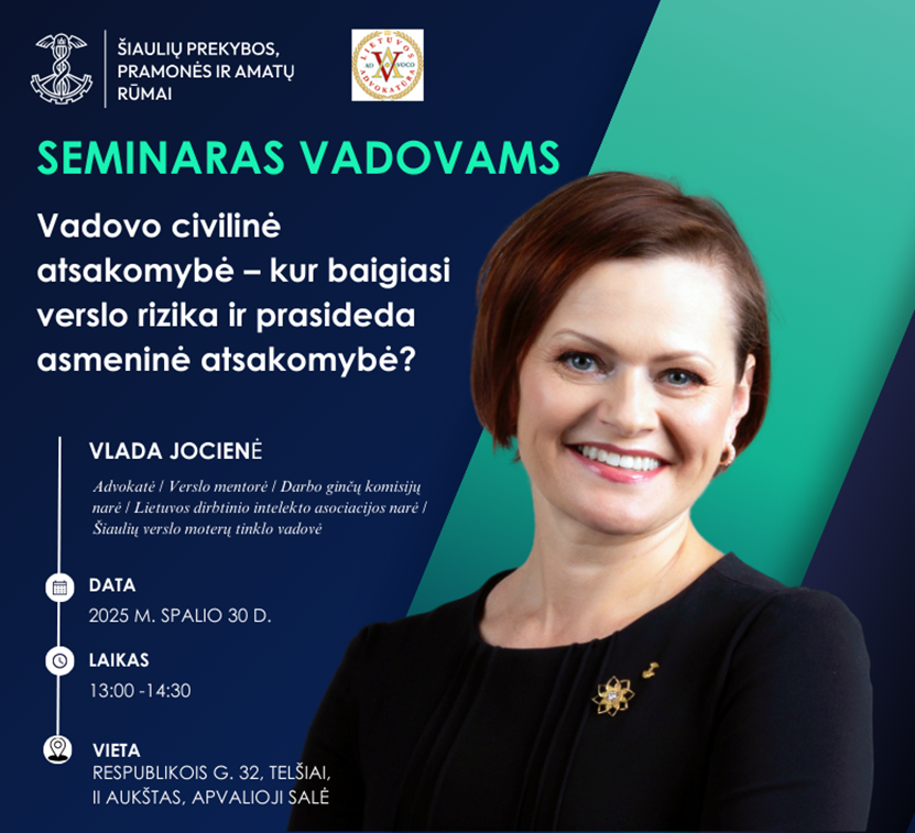 Spalio 30 d. 13 val. kviečiame į vadovams skirtą seminarą Telšiuose tema „Vadovo civilinė atsakomybė – kur baigiasi verslo rizika ir prasideda asmeninė atsakomybė?“. Atsakomybė prasideda nuo žinojimo. Jeigu Jūs rūpinatės ne tik įmonės, bet ir savo asmenine teisine apsauga – tuomet šis seminaras kaip tik Jums.
