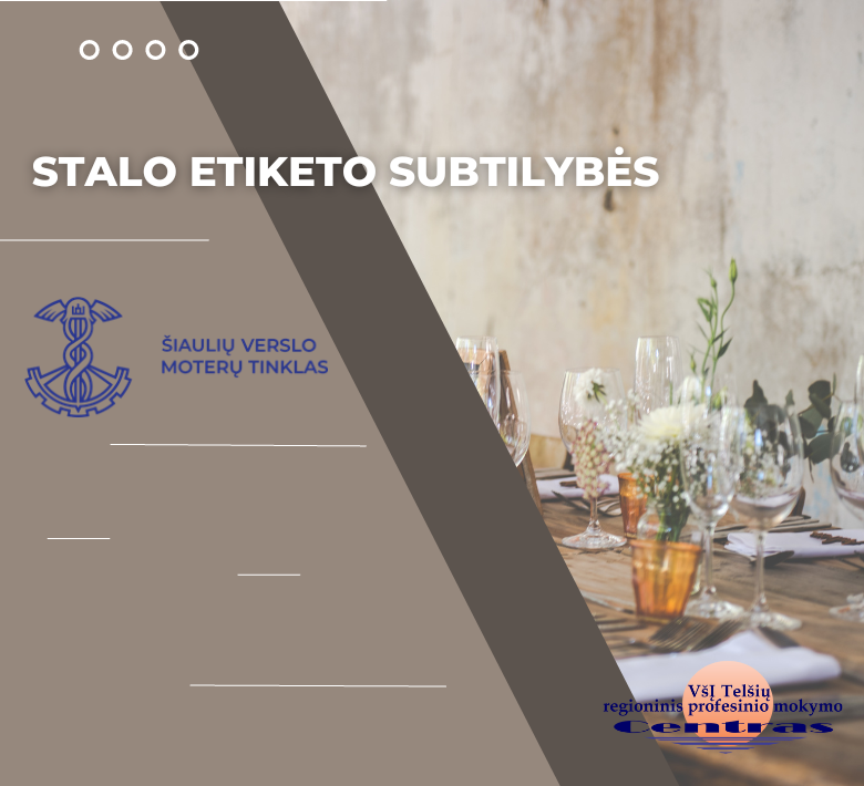 Šiaulių VMT kartu su Telšių profesinio rengimo centru, kavine „Senamiestis“ bei ŠPPAR Telšių filialu kviečia verslo moteris į Telšius, kur Jūsų lauks edukacija „Stalo etiketo subtilybės“ ir susitikimas su Rietavo moterų užimtumo centro atstovėmis.