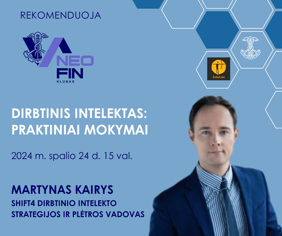 Lektorius Martynas Kairys, SHIFT4 dirbtinio intelekto strategijos ir plėtros vadovas, apžvelgs dirbtinio intelekto įrankių naudojimą ir padės atlikti praktines užduotis.