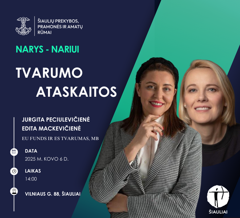 Kovo 6 dieną kviečiame į susitikimą, kuriame rūmų narė Jurgita Peciulevičienė, įmonių MB „EU Funds“ ir MB „ES Tvarumas“ savininkė, vadovė, kartu su tvarumo eksperte Edita Mackevičiene pateiks veiksmų vadovą – 10 žingsnių į CSRD (tvarumo ataskaitų rengimą).