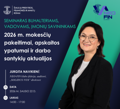 NEO-FIN finansininkų klubas kviečia į seminarą buhalteriams, vadovams, įmonių savininkams: „2026 m. mokesčių...