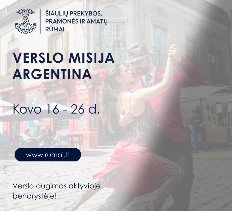 Kovo 16 – 26 dienomis (datos gali keisis per kelias dienas) organizuojame verslo misiją į ARGENTINĄ. Susipažinsime su Buenos Airės regionu, verslo aplinka. Pagal įmonių poreikį vyks verslo susitikimai, numatyti vizitai į prekybos, pramonės rūmus, lankysimės vietos įmonėse.