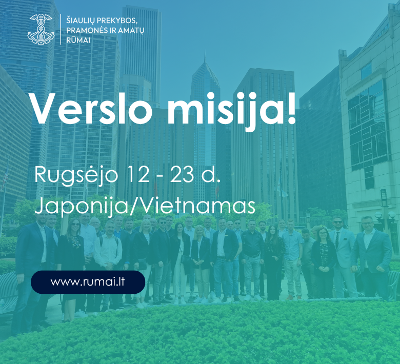 Rugsėjo 12 – 23 dienomis organizuojame verslo misiją į JAPONIJĄ – VIETNAMĄ. Parodos EXPO 2025 lankymas, vakarienė su LR ambasados atstovais, verslo galimybių Japonijoje ir ambasados pagalbos Lietuvos verslams pristatymas, Pažangių Fukuyamos įmonių lankymas, Kultūrinės ir infrastruktūrinės aplinkos pažinimo vizitas (Nara ir Kyoto miestas), Verslo aplinkos pažinimas Vietname, Hošimino regione, vizitas į Prekybos, pramonės rūmus.