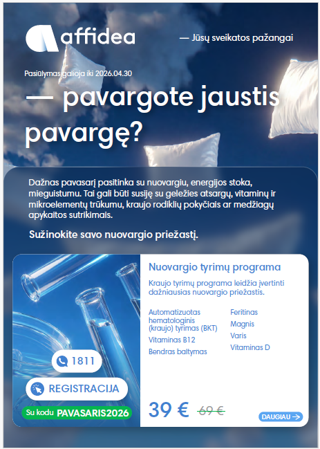 Specialus pasiūlymas – Nuovargio tyrimų programa (7 tyrimai) – 39 Eur su kodu PAVASARIS2026 (registruojantis trumpuoju numeriu 1811; standartinė kaina 69 Eur).