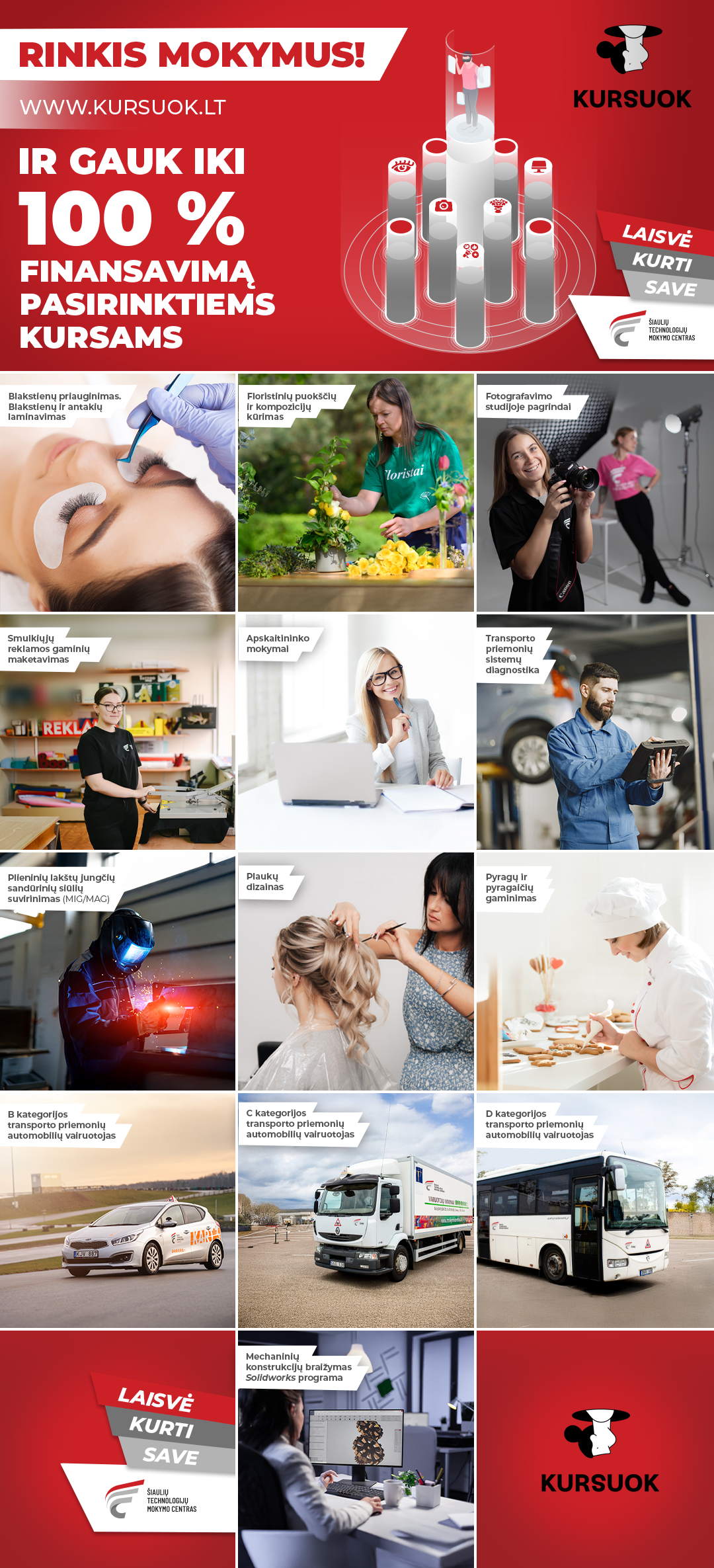 Siūlomų mokymų sąrašas (pasirinkę norimus mokymus, rasite registracijos formą): https://www.stmc.lt/stojantiems/mokymasis-visa-gyvenima-imp/kursai-suaugusiems-asmenims/